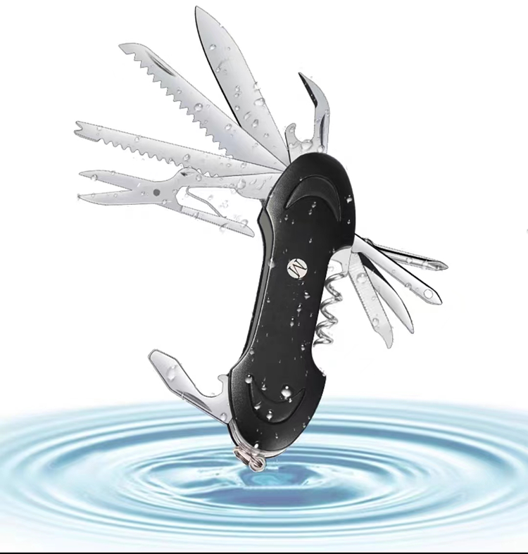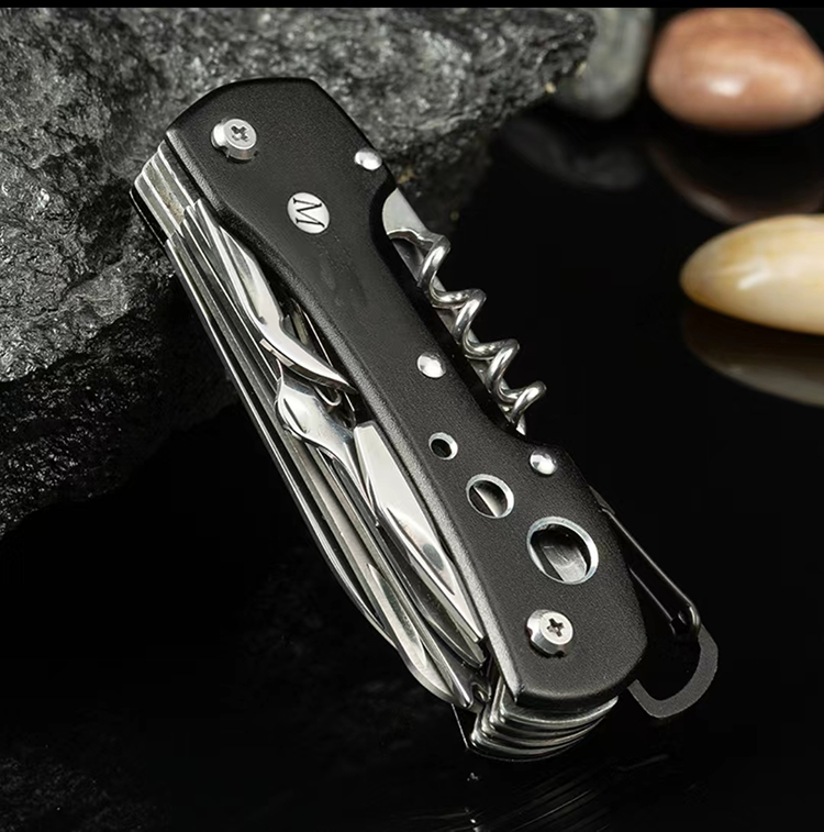 多功能刀又常稱為多功能戶外刀或萬用刀,是含有許多工具在一個刀身上的折疊小刀。多功能刀的組合工具不僅表現(xiàn)在品種上,同時還在于巧妙的組合在同一種工具上,使有限的工具發(fā)揮更多的實功能。一把普通的多功能刀,一般都有主刀、小刀、剪刀、開瓶器、木鋸、小改錐、拔木塞鉆、牙簽、小鑷子等工具。而在一些工具上還設計了多種功用。