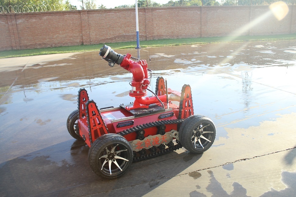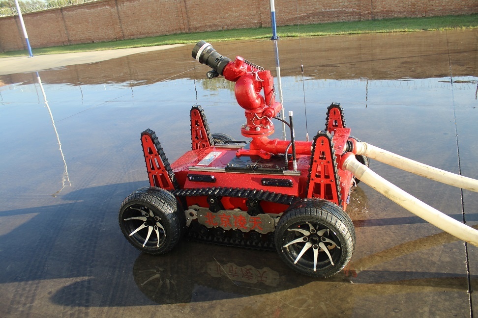 1. 消防排煙偵察機器人底盤設計履帶+擺臂+輪式,前后雙擺臂和履帶能夠行駛各種復雜地形,輪胎采用金屬內(nèi)圈,即提高了行走速度,又保障了在高溫外部橡膠融化后,依然可以行走。