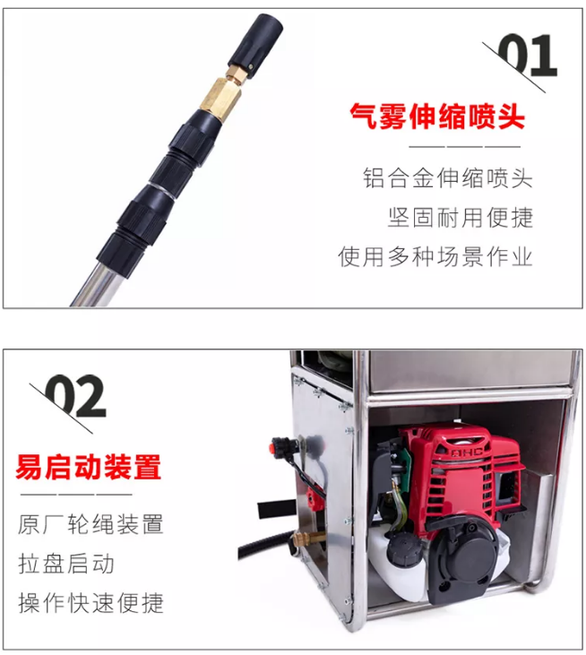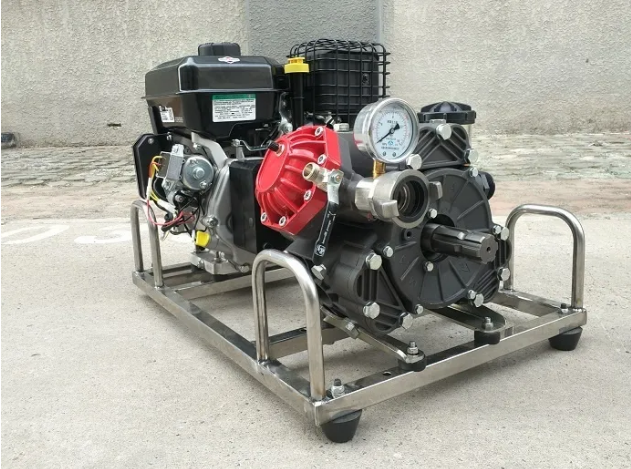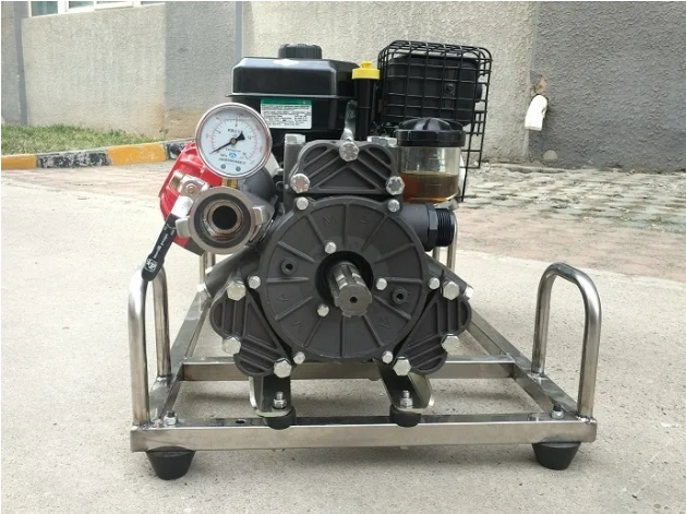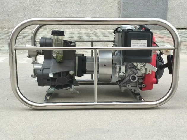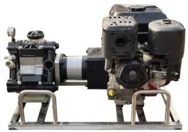 不銹鋼架,便于攜行。泵軸水平布置,減少震動。水泵泵體為柱塞液壓隔膜泵。允許砂石顆粒通過,對水質要求低,對發(fā)動機功率損耗小。泵組可在橫向、縱向傾斜達到25°時正常工作。水帶直徑25mm,爆破壓力18MPa,表層滌綸長絲,內襯進口橡膠,高壓森林接口連接。水泵配備的動力裝置為強制風冷四沖程汽油機。我們的行星減速機通過特殊的處理方式,在發(fā)動機轉數(shù)超過2000轉的情況下,不會削弱發(fā)動機的動力,反而有助于發(fā)動機的動力,提高水泵的效率。