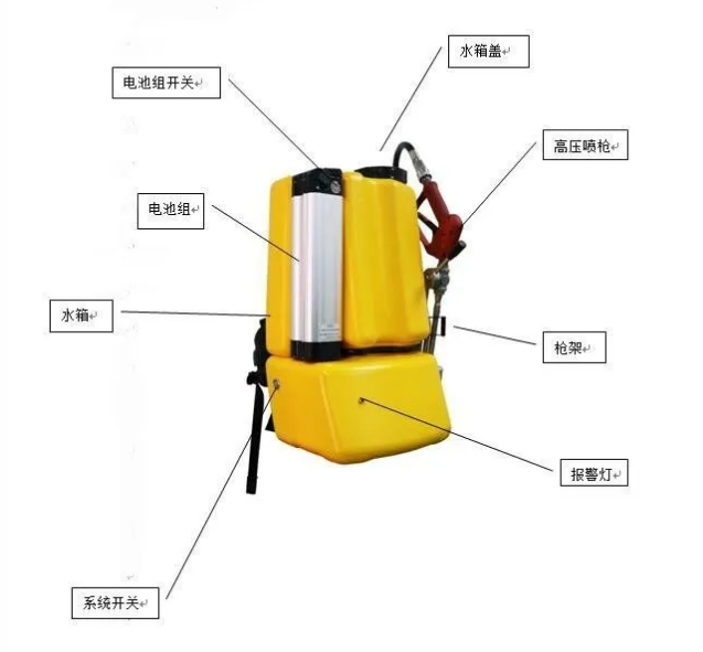 本產品是電機驅動水泵產生一定壓力的水流,通過對水流壓力和流量的控制后,再通過可產生細水霧的專用噴槍噴出進行滅火的裝置。改裝置設置了限壓限流、缺水保護、欠壓提醒等多種保護。系統(tǒng)沒有壓力容器。徹底解決了使用壓力容器的安全隱患。
