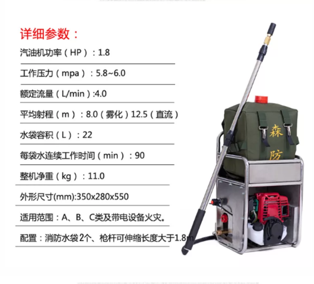 不銹鋼架,便于攜行。泵軸水平布置,減少震動 水泵泵體為柱塞液壓隔膜泵。允許砂石顆粒通過,對水質要求低,對發(fā)動機功率損耗小。 泵組可在橫向、縱向傾斜達到25°時正常工作。 水帶直徑40mm,爆破壓力18MPa,表層滌綸長絲,內襯進口橡膠,高壓森林接口連接。 水泵配備的動力裝置為強制風冷四沖程汽油機。