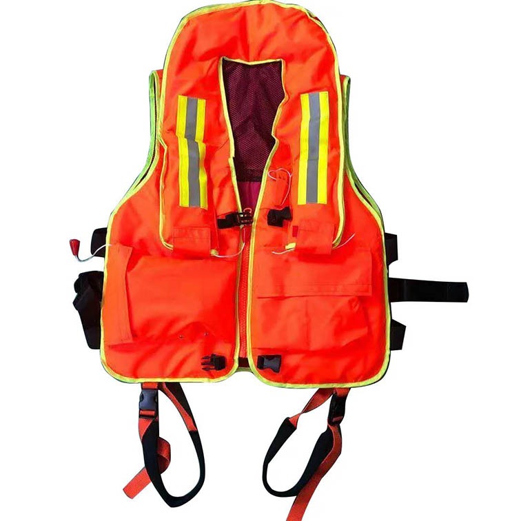 消防專用救生衣由背心式救生衣體、救生衣氣囊、氣脹式救生圈、輔件及屬具組成。背心式救生衣體由固有浮力材料及包布組成。救生衣輔件主要包括拉鏈、敷帶、反光帶、搭扣及掛環(huán)等,其中敷帶包括襠帶和收緊帶。