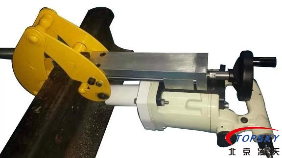 鋼軌鉆由主機、雙重斷水保護(hù)裝置、進(jìn)口硬質(zhì)合金鋼軌鉆頭、凈化器、張緊裝置等組成,液壓膠管總成將氣源和主機連接起來,經(jīng)過凈化的氣源提供的氣壓驅(qū)動鋼軌鉆投高速鉆進(jìn),進(jìn)行切割。灑水冷卻噴頭和雙重斷水保護(hù)裝置起到冷卻和降塵的作用,保護(hù)機器正常運轉(zhuǎn)。