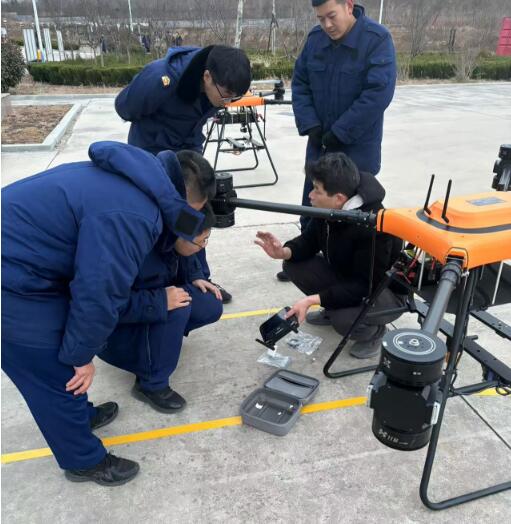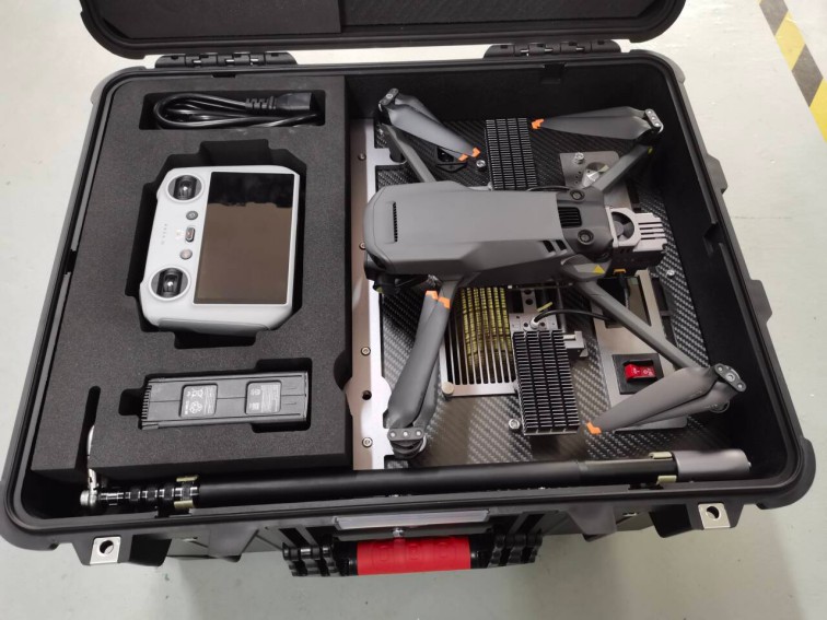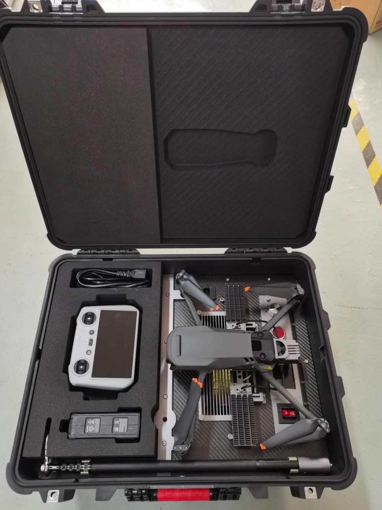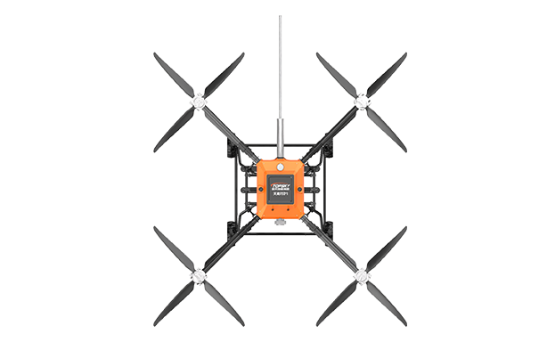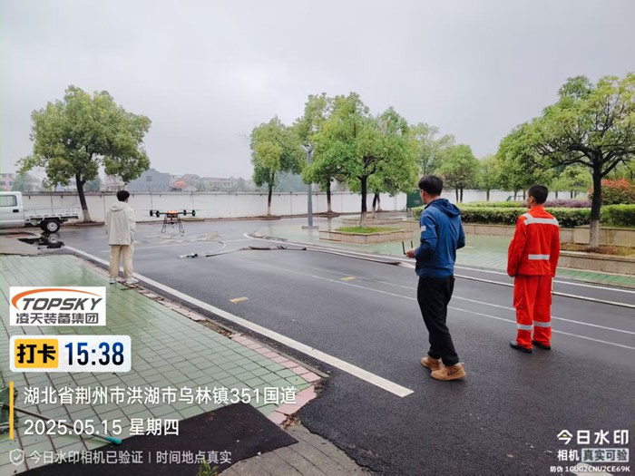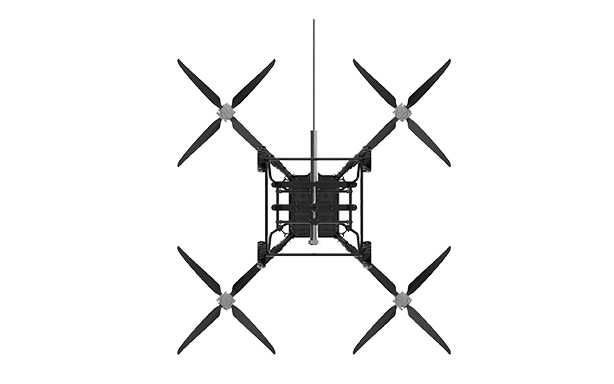 該無人機可裝載在消防車上,能快速啟動升空,通過特制高壓水帶與消防車水罐連接,消防車水罐內(nèi)部高效泡沫/水基滅火劑輸送到無人機平臺,在水槍噴口水平噴射出去,達到滅火的效果。