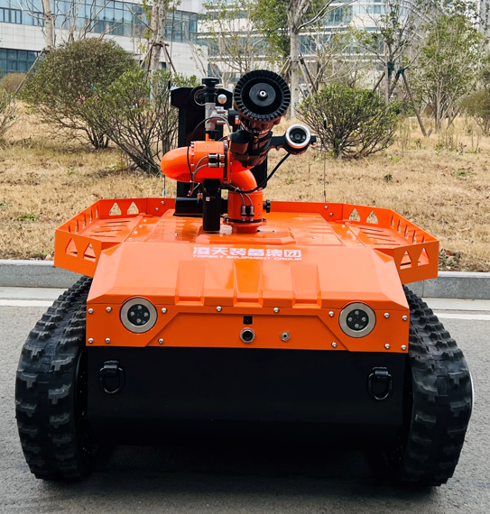 機(jī)器人采用無線遙控設(shè)計(jì),遙控器與監(jiān)視器一體/分離,可實(shí)時(shí)的顯示電池、內(nèi)部的各種信息,機(jī)器人狀態(tài)、現(xiàn)場(chǎng)溫濕度、有毒有害氣體濃度報(bào)警信息等控制機(jī)器人前進(jìn)、后退、轉(zhuǎn)向等運(yùn)動(dòng)。具備遠(yuǎn)程偵察能力,機(jī)身搭建升降云臺(tái)、高清攝像頭、熱成像攝像頭、氣體傳感器三類環(huán)境感知設(shè)備和云臺(tái)控制設(shè)備,也可聯(lián)動(dòng)聲光報(bào)警模塊提醒消防人員或群眾,有效避免危險(xiǎn)。在通過遠(yuǎn)程偵察手段有效獲取現(xiàn)場(chǎng)火源信息后,機(jī)器人配備的大功率電機(jī)可以幫助消防人員將消防水袋拖拽至危險(xiǎn)火源區(qū)域進(jìn)行滅火,并能搭載各類國內(nèi)、外的多種消防水泡,并能夠遠(yuǎn)程控制發(fā)射水或泡沫?;谒鋫涞氖耙裟K和揚(yáng)聲器模塊,拾取現(xiàn)場(chǎng)環(huán)境聲音,即使消防官兵未靠近消防現(xiàn)場(chǎng)也能夠聽到搜救現(xiàn)場(chǎng)的群眾呼救聲,并通過揚(yáng)聲器模塊與群眾進(jìn)行現(xiàn)場(chǎng)對(duì)話。