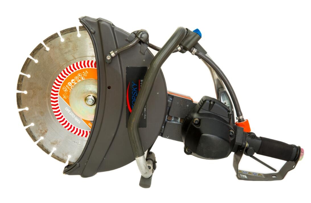 氣動金剛石鏈條鋸由進口金剛石鏈條鋸頭、液壓膠管總成、自加壓冷卻水箱三大部分組成,液壓膠管總成將氣源和金剛石鏈條鋸連接起來,氣源提供的氣壓驅(qū)動金剛石鏈條鋸高速運轉(zhuǎn),進行切割。工作時,冷卻水通過鏈板中間的孔流向切割部位,起到冷卻和降塵的作用。