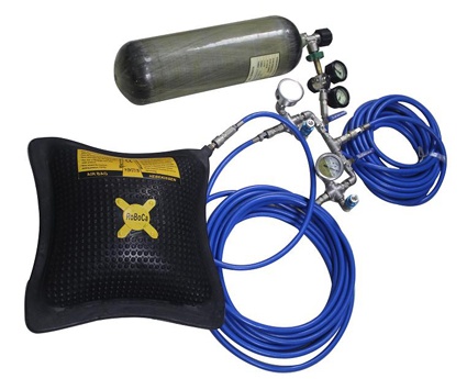 高壓氣瓶通過壓力調(diào)節(jié)器(減壓閥)的減壓,將25MPa的高壓空氣降低到0.8MPa低壓空氣,0.8MPa低壓空氣通過雙向控制器連接兩個氣墊或兩個氣囊,可完成兩組起重操作??刂破饔呻p向控制器和單向控制器兩種類型,顧名思義,雙向控制器可連接兩個氣墊或兩個氣囊,單向控制器可連接1個氣墊或1個氣囊。氣囊與氣墊的區(qū)別為,氣囊起重力小,起重高度高,氣墊剛好相反。
