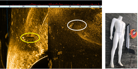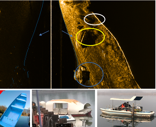 其中,藍色箭頭指向藍色線條為自動檢測的水底線,三艘沉船,分別對應(yīng)實物如下,小船約為3米長,大船約為5米長。