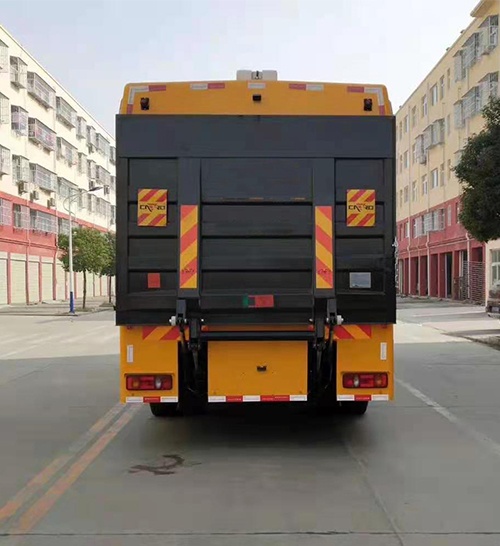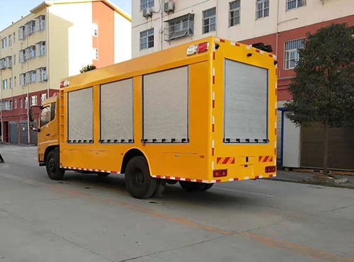 廂體外部鋼材為優(yōu)質(zhì)冷軋鋼板,內(nèi)襯優(yōu)質(zhì)冷軋鋼板折彎骨架,工藝先進(jìn),強(qiáng)度牢固。廂體為全密封結(jié)構(gòu),具備運(yùn)輸、防雨、防腐、防火、防銹要求。車(chē)廂尾部安裝鋁合金卷簾門(mén)。發(fā)電機(jī)組進(jìn)排風(fēng)消聲處理,消聲器做降噪處理。車(chē)廂水泵兩側(cè)設(shè)開(kāi)門(mén),發(fā)電機(jī)進(jìn)風(fēng)口和排風(fēng)口防雨百葉窗,工作門(mén)下,尾部設(shè)有隱藏式抽拉梯,與車(chē)廂底板框架連接。